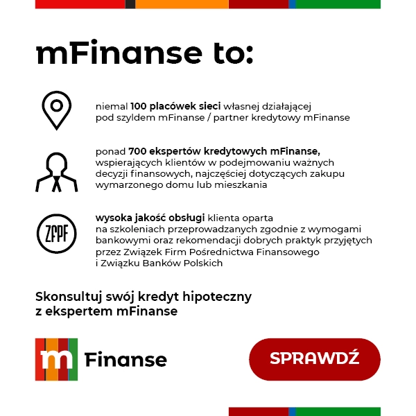 Informujemy, że nawiązaliśmy współpracę z firmą pośrednictwa kredytowego mFinanse S.A. Zapraszamy do współpracy z ekspertami, którzy przedstawią aktualne oferty kredytowe wielu banków i pomogą w finalizacji procesu kredytowego.